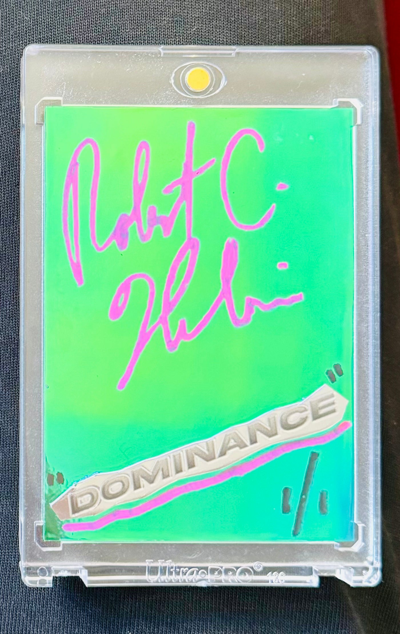 This is a custom made art card and the only one of this kind in existence (1/1). Standard trading card size (2.5”x3.5”), mixed media. The buyer receives the card securely packaged in a magnetic hard plastic “one touch” case for easy display and secure storage along with a digital certificate of authenticity (upon buyer request—please supply best email). This art product is signed by the artist (Robert C. Huckins). Outstanding for any fan, card or art collector! |