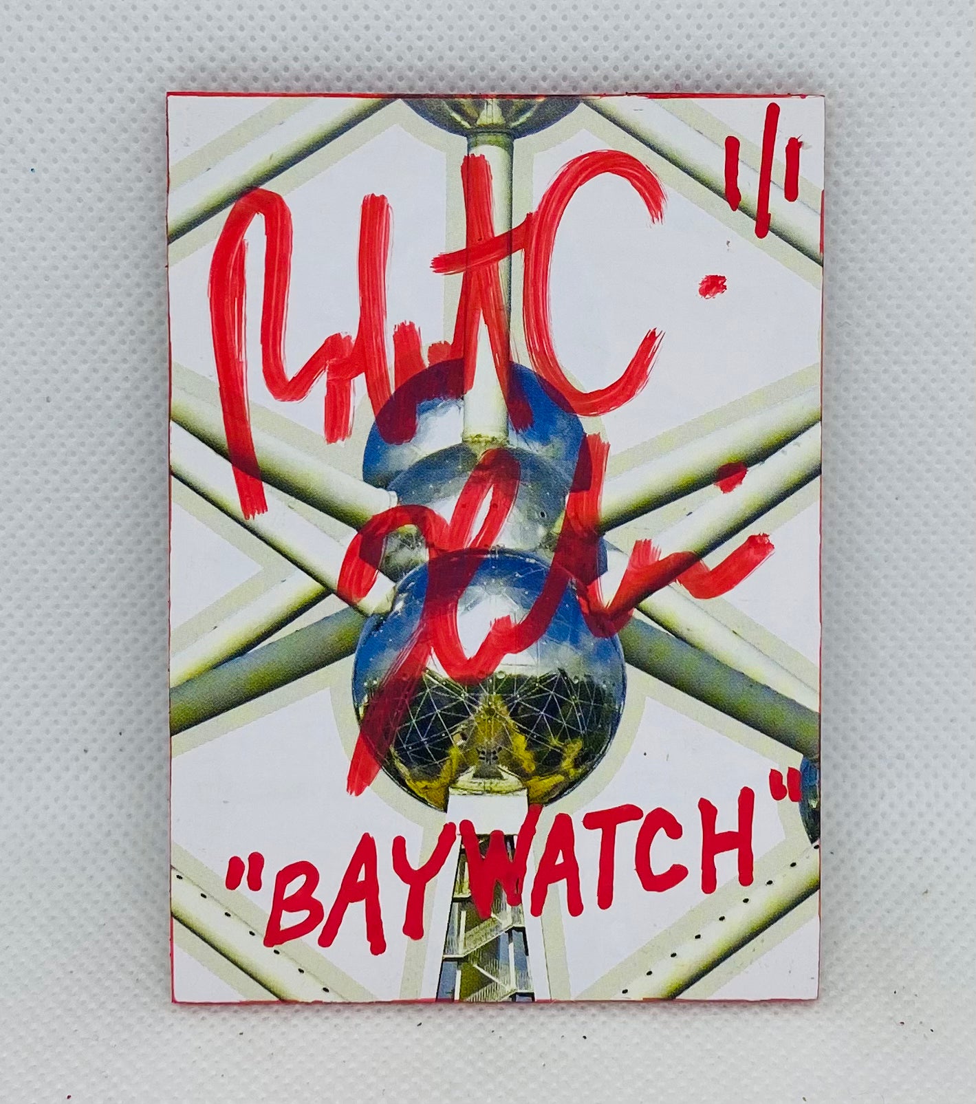 This is a custom made art card and the only one of this kind in existence (1/1). Standard trading card size (2.5”x3.5”), mixed media. The buyer receives the card securely packaged in a magnetic hard plastic “one touch” case for easy display and secure storage along with a digital certificate of authenticity (upon buyer request—please supply best email). This art product is signed by the artist (Robert C. Huckins). Outstanding for any fan, card or art collector! |