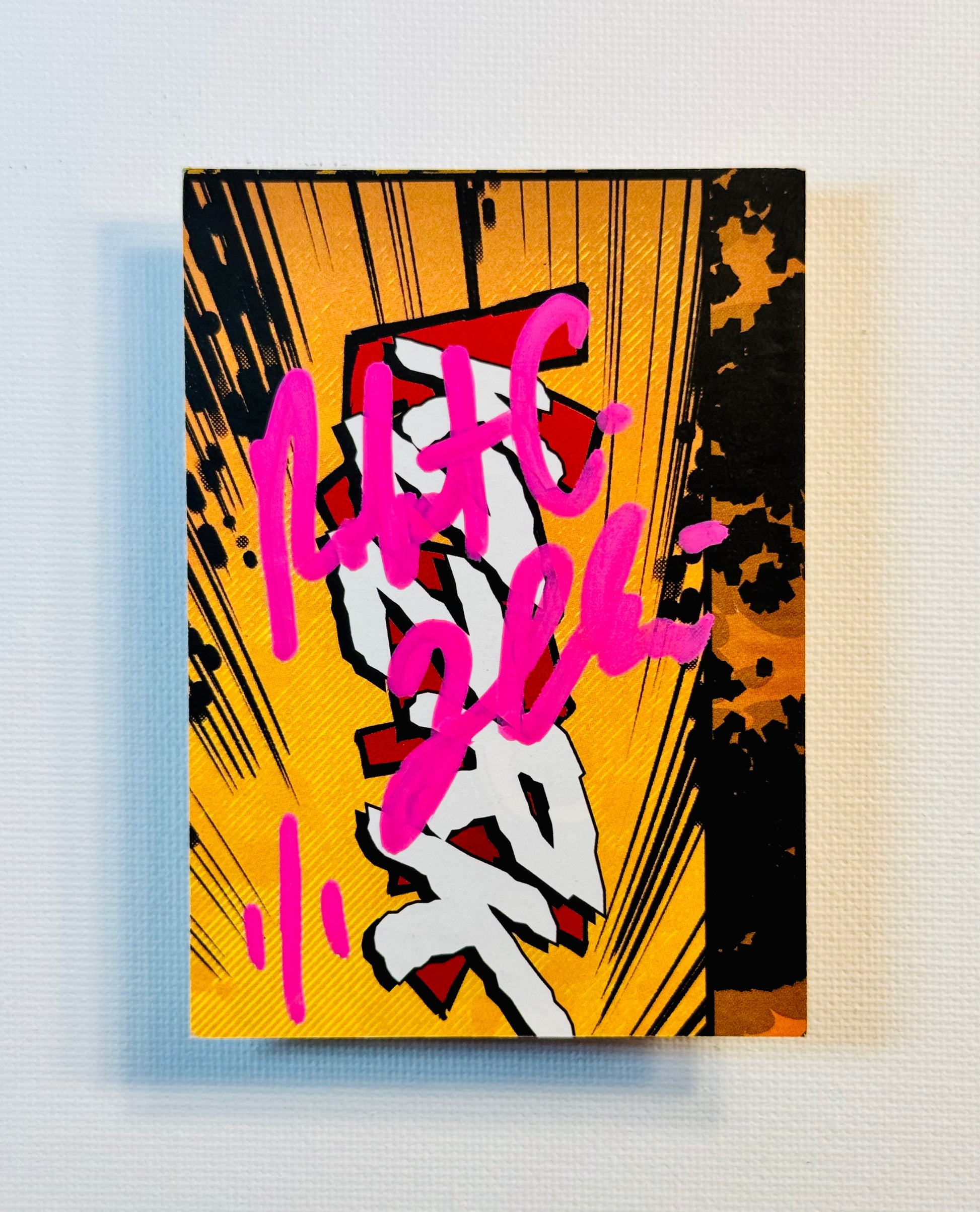 This is a custom made art card and the only one of this kind in existence (1/1). Standard trading card sized (2.5”x3.5”), mixed media with acrylic paints. The buyer receives the card securely packaged in a magnetic hard plastic “one touch” case for easy display and secure storage along with a digital certificate of authenticity (upon buyer request—please supply best email). This art product is signed by the artist (Robert C. Huckins). Outstanding for any fan, card or art collector! |
