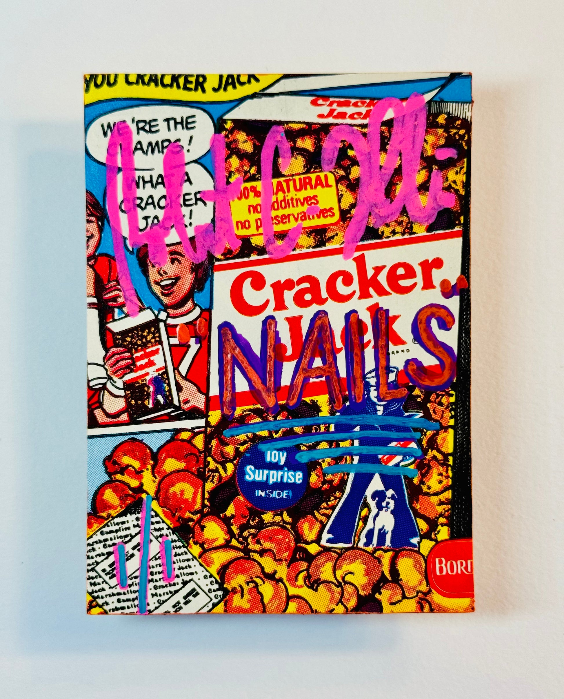 This is a custom made art card and the only one of this kind in existence (1/1). Standard trading card sized (2.5”x3.5”), mixed media (real nails!) with acrylic paints. The buyer receives the card securely packaged in a magnetic hard plastic “one touch” case for easy display and secure storage along with a digital certificate of authenticity (upon buyer request—please supply best email). This art product is signed by the artist (Robert C. Huckins). Outstanding for any fan, card or art collector! |